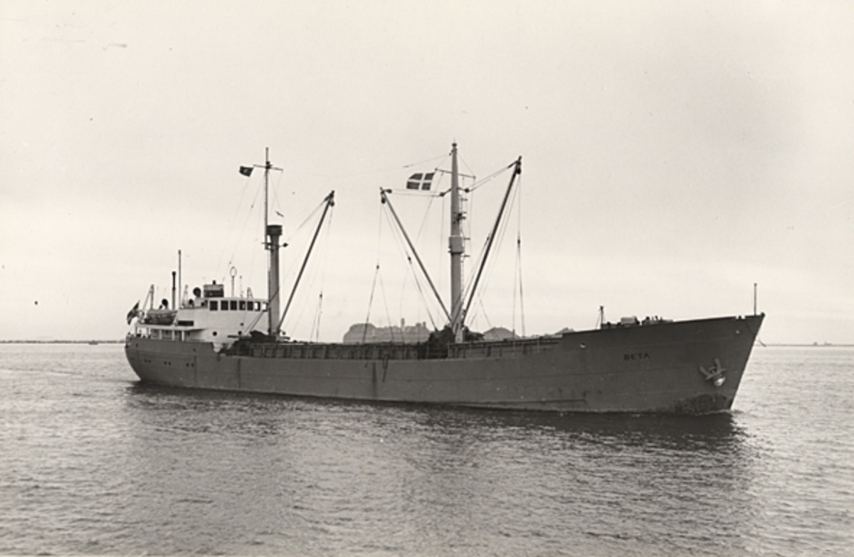 Foto i svartvitt visande lastmotorfartyget "BETA" i Köpenhamn den 7.3.1956.