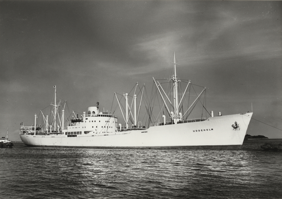 Foto i svartvitt visande lastmotorfartyget "UDDEHOLM" i Köpenhamn under år 1956.