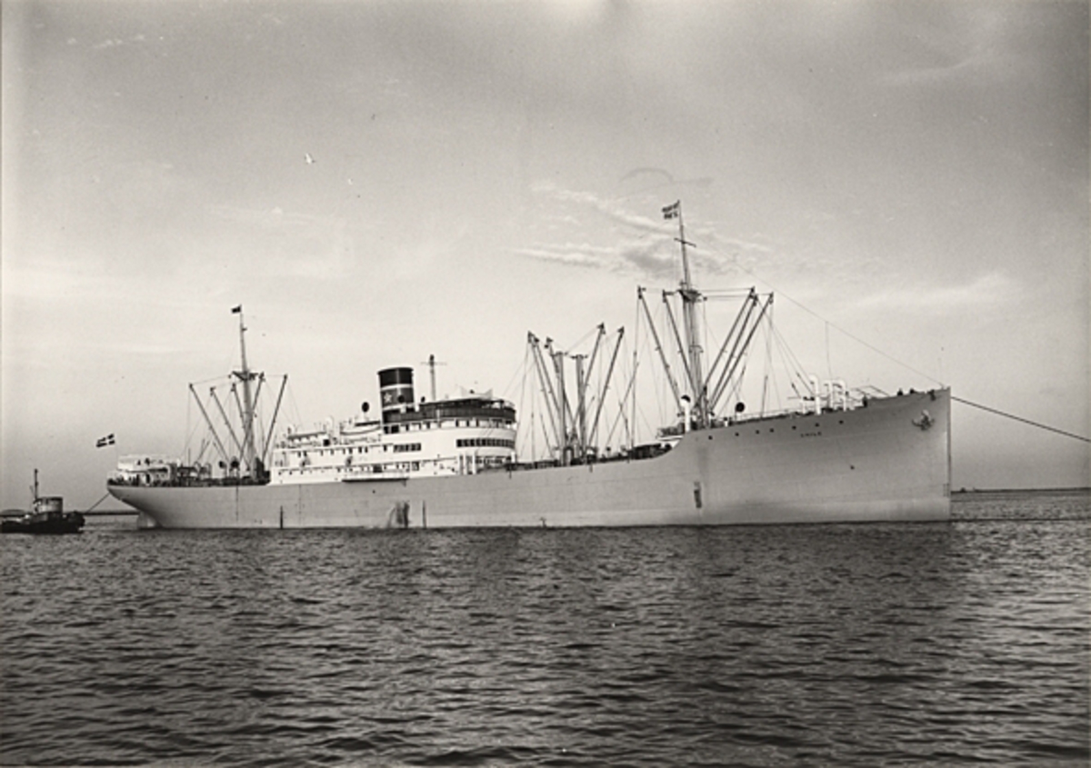 Foto i svartvitt visande lastmotorfartyget "CHILE" i Köpenhamn den 12.7.1956.