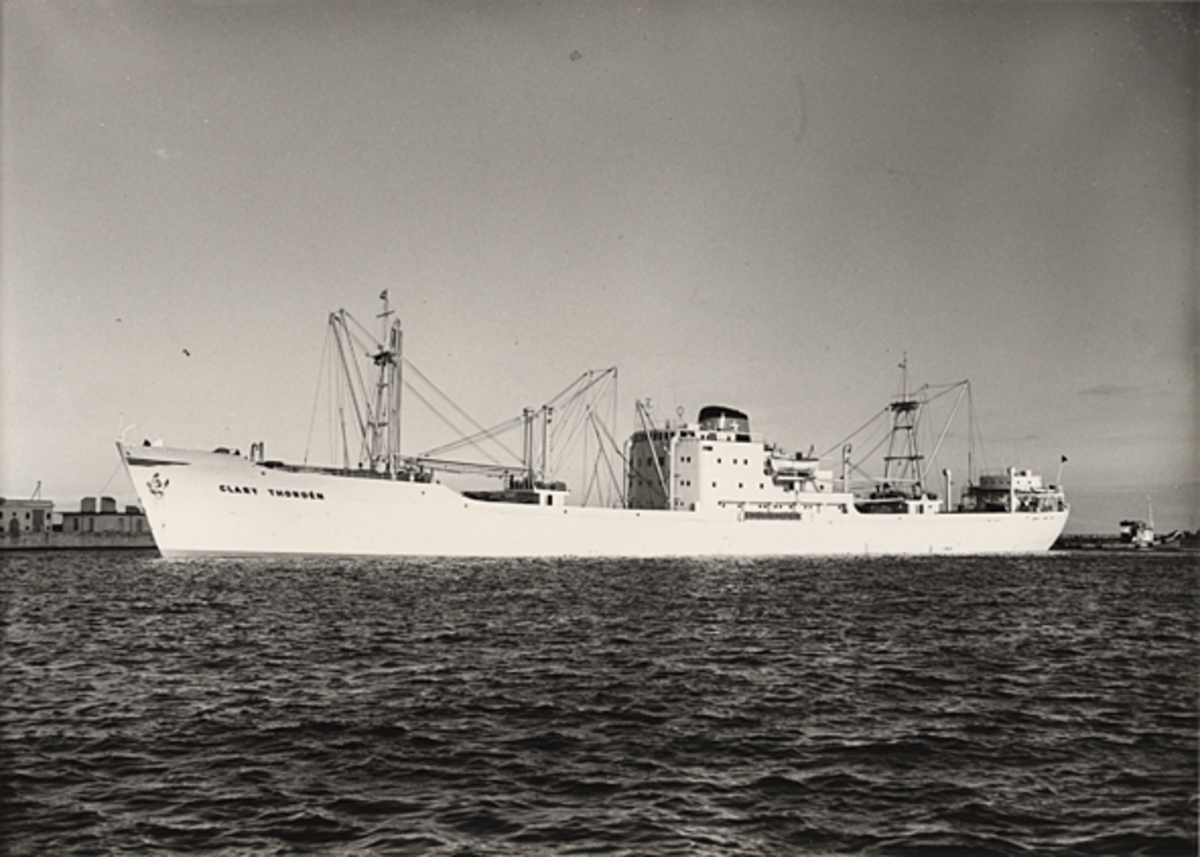 Foto i svartvitt visande lastmotorfartyget "CLARY THORDÉN" i Köpenhamn den 15.8.1956.