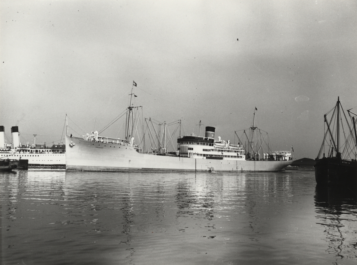 Foto i svartvitt visande lastmotorfartyget "URUGUAY" i Köpenhamn den 5.5.1956.