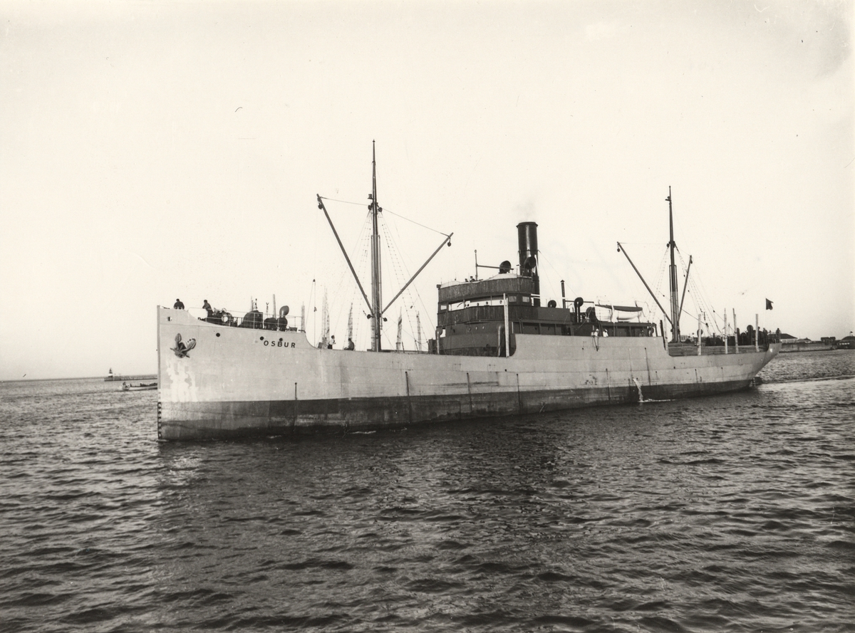 Foto i svartvitt visande lastångfartyget "OSBUR" i Köpenhamn.