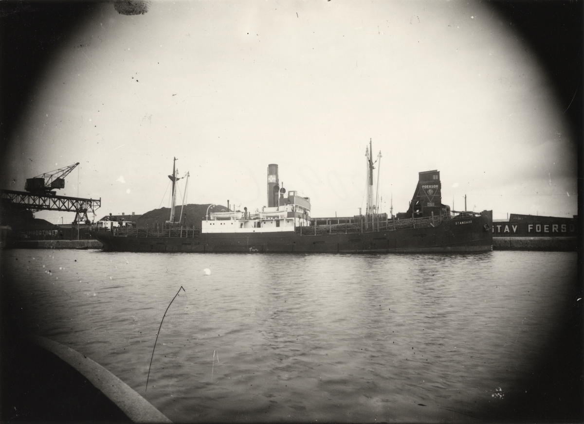 Foto i svartvitt visande lastångfartyget "STANDARD" vid kaj i Köpenhamn.
