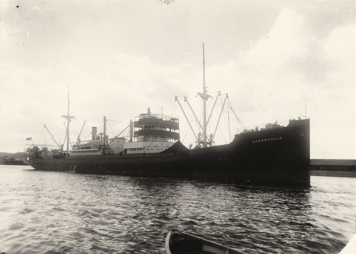 Foto i svartvitt visande lastmotorfartyget "SPARREHOLM" i Köpenhamn.
