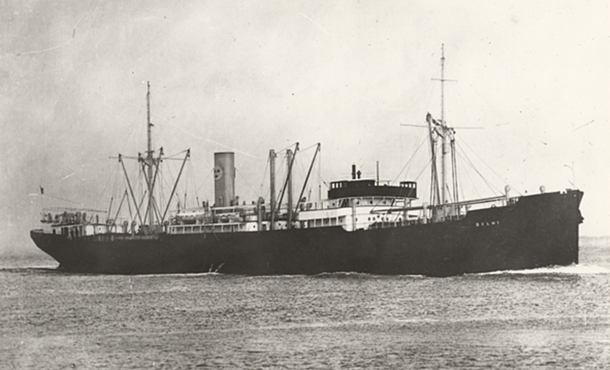 Foto i svartvitt visande lastmotorfartyget "DELHI" av Göteborg.