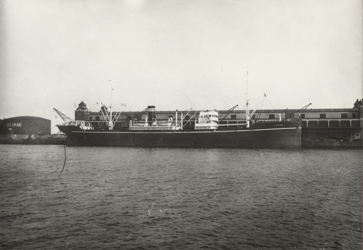 Foto i svartvitt visande lastmotorfartyget "TOPEKA" av Tönsberg i Köpenhamn under 1930-talet.