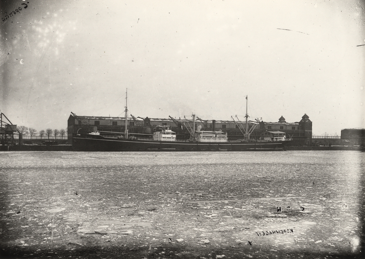 Foto i svartvitt visande lastmotorfartyget "INDRA" av Haugesund vid kaj i Köpenhamn, troligen under 1930-talet.