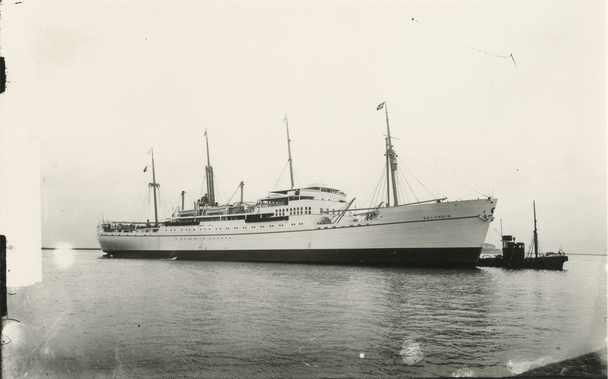 Foto i svartvitt visande passagerarmotorfartyg Selandia av Köpenhamn i Köpenhamn.