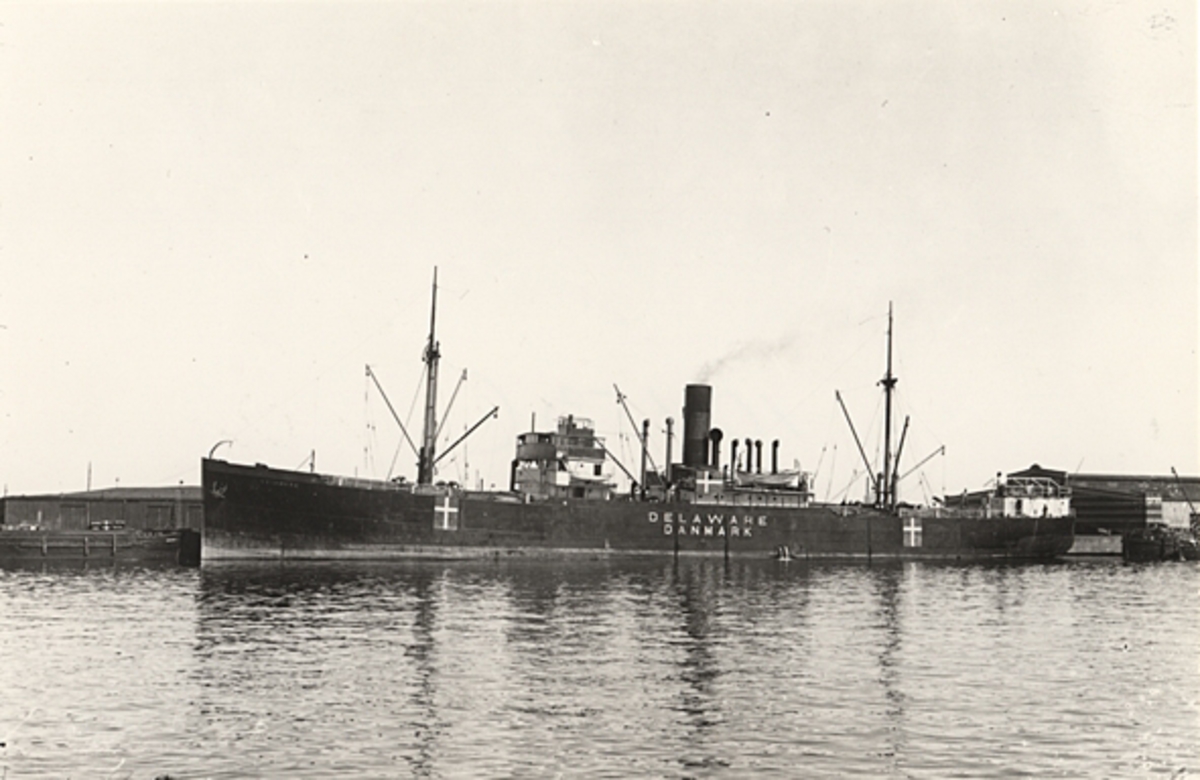 Foto i svartvitt visande lastturbinångfartyget "DELAWARE" av Köpenhamn vid kaj i Köpenhamn, under 1940-talet.