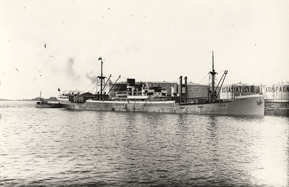 Foto i svartvit visande lastmotorfartyget "BONITA" av Esbjerg i Köpenhamn.