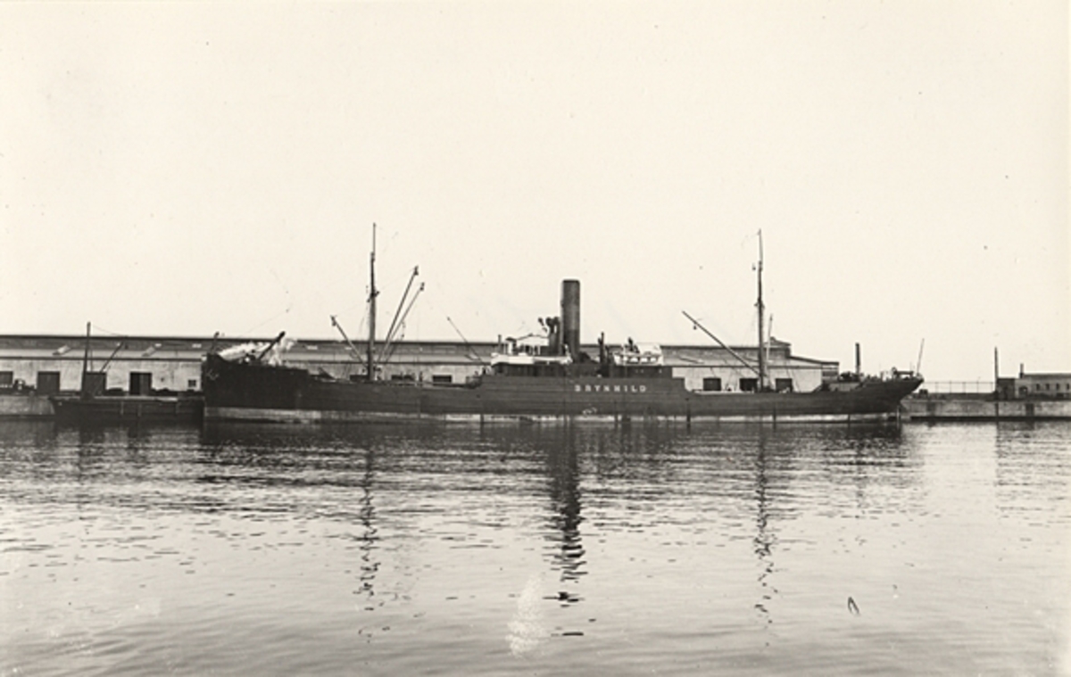 Foto i svartvitt visande lastångfartyget "BRYNHILD" av Helsingör vid kaj i Köpenhamn.