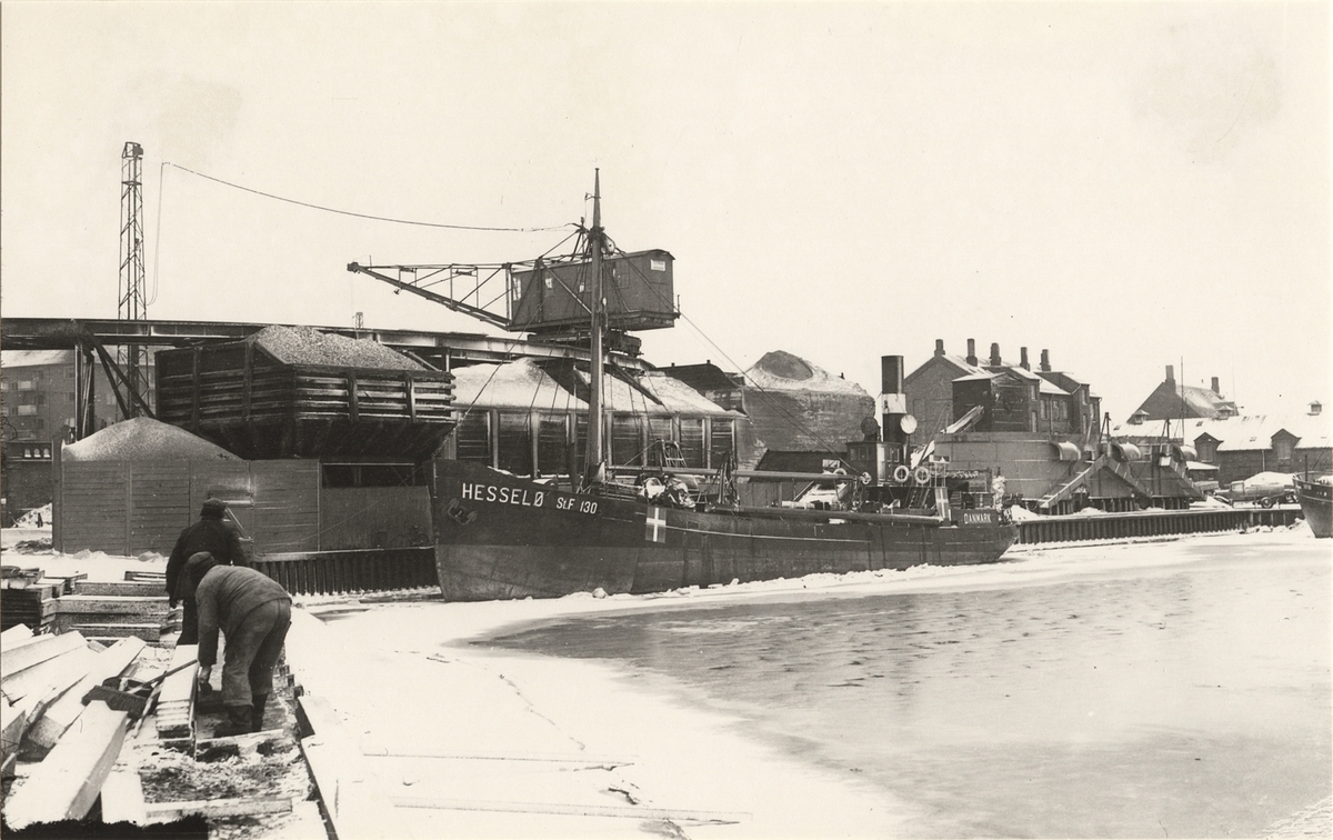 Foto i svartvitt visande lastångfartyget "HESSELÖ" av Köpenhamn vid kaj i Köpenhamn.