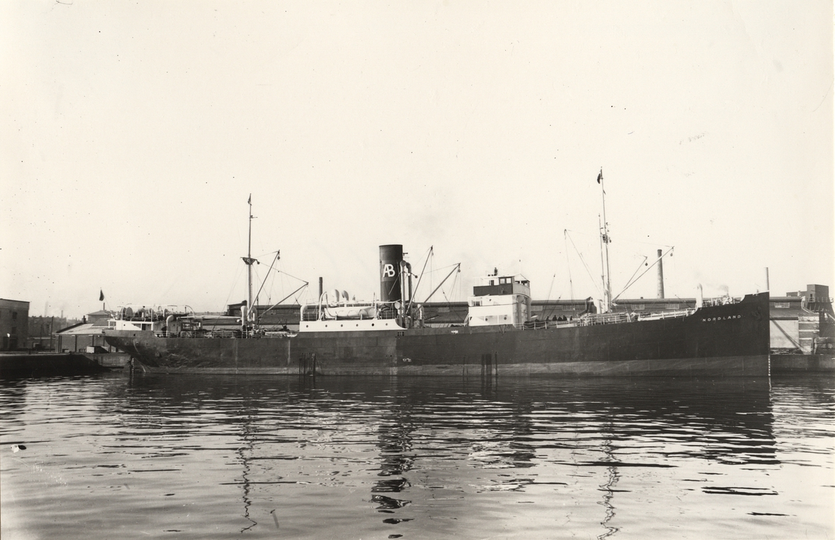 Foto i svartvitt visande lastmotorfartyget "NORDLAND" av göteborg vid kaj i Köpenhamn under 1930-talet.