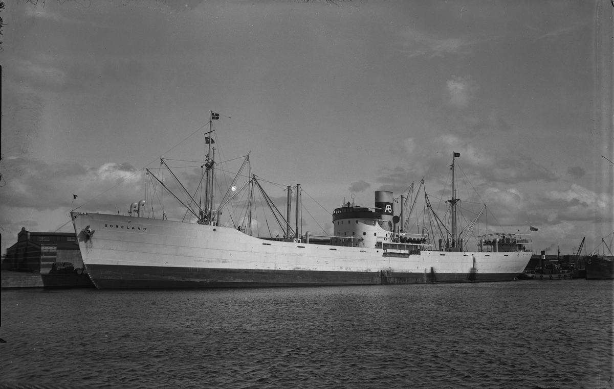 Foto i svartvitt visande lastmotorfartyget "BORELAND" av Göteborg, vid kaj i Köpenhamn.