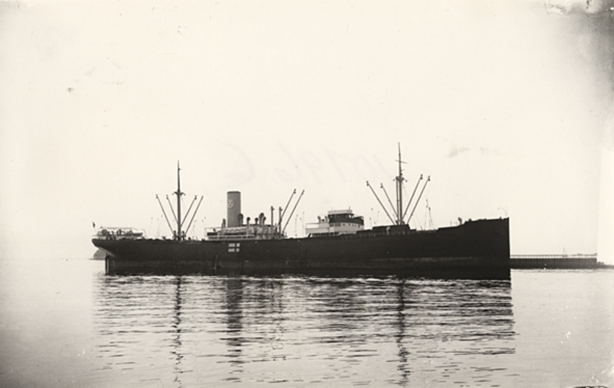 Foto i svartvitt visande lastmotorfartyget "FORMOSA" av Göteborg i Köpenhamn under år 1940.