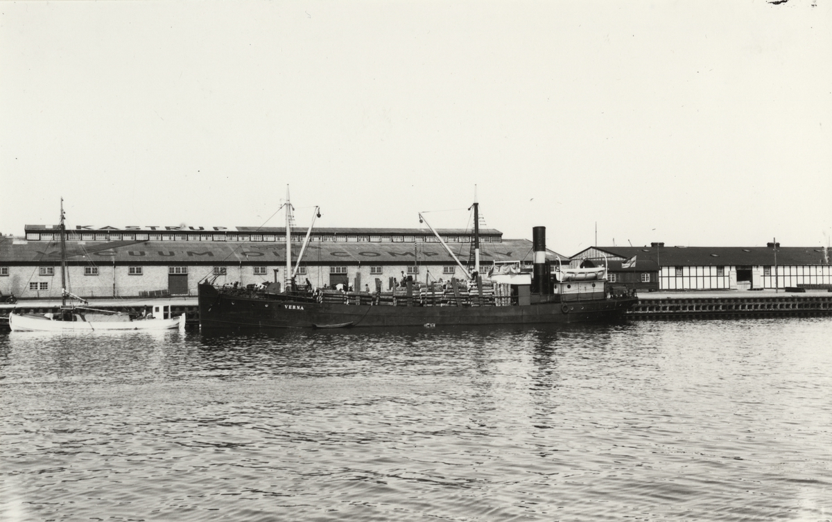 Foto i svartvitt visande lastångfartyget "VERNA" av Göteborg, vid kaj i Köpenhamn.