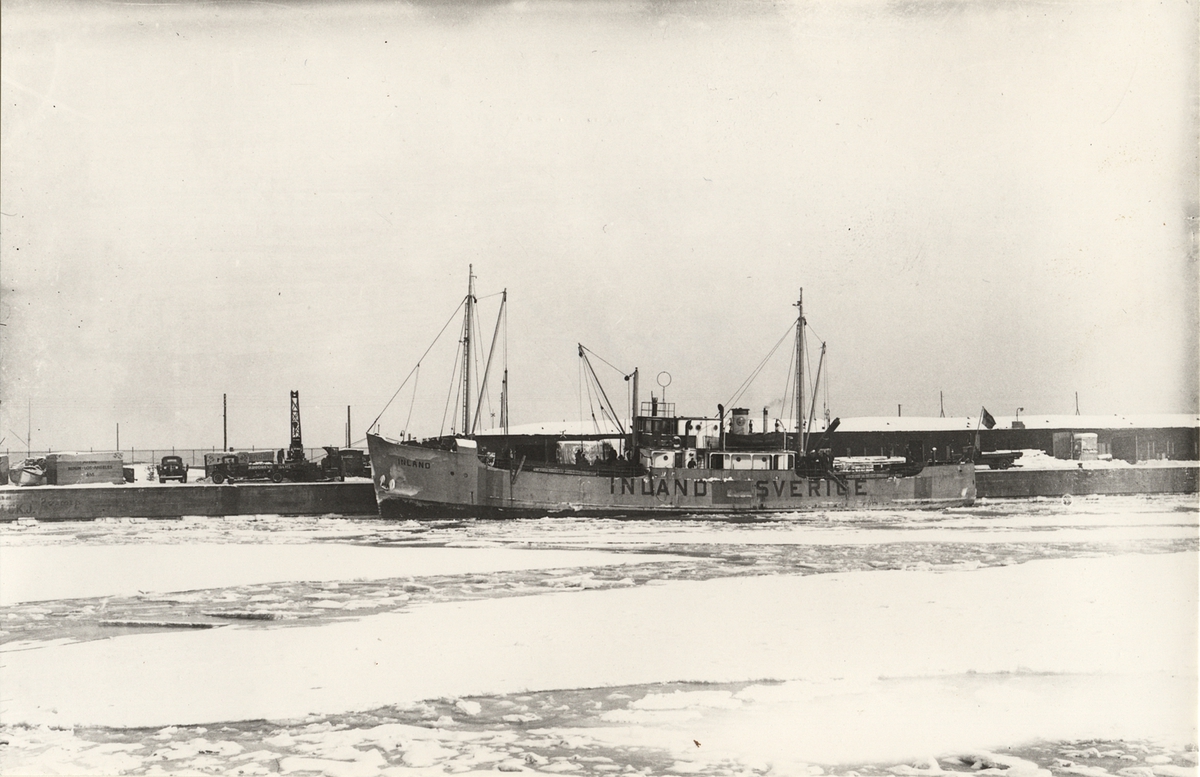 Foto i svartvitt visande lastmotorfartyget "INLAND" av Göteborg, vid kaj i Köpenhamn i början av 1940-talet.