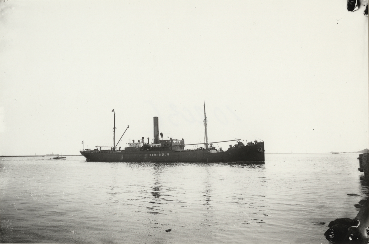 Foto i svartvitt visande lastångfartyget "TAARNHOLM" av Aalborg i Köpenhamn.