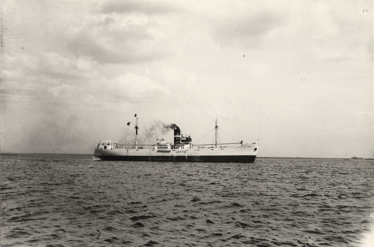 Foto isvartvitt visande lastångfartyget "LOTTA" av Esbjerg, i farvattnen kring Köpenhamn under 1938-40.