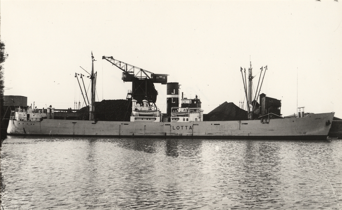 Foto isvartvitt visande lastångfartyget "LOTTA" av Esbjerg, vid kaj i Köpenhamn under 1938-40.