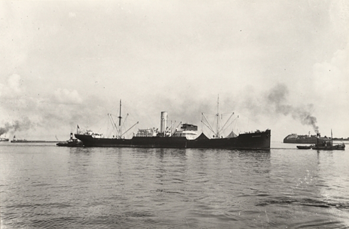 Foto i svartvitt visande lastångfartyget "BRAHEHOLM" under bogsering i Köpenhamn.