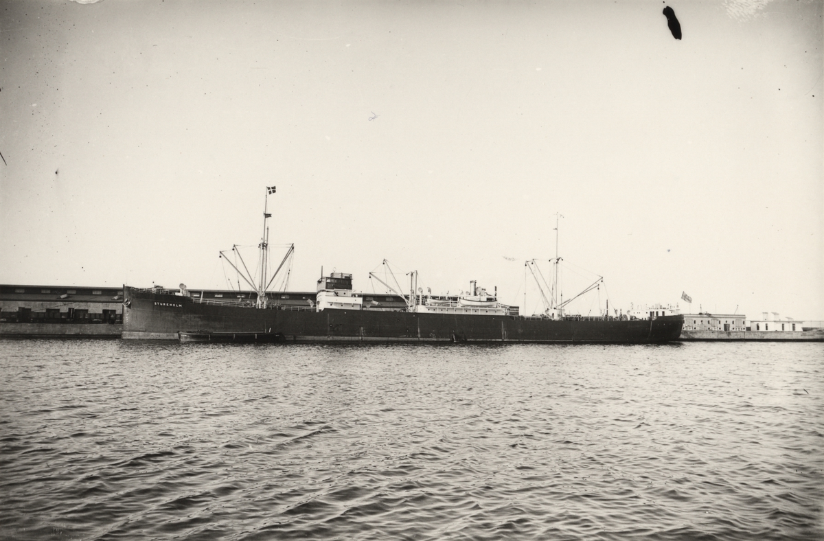 Foto i svartvitt visanda lastmotorfartyget "STUREHOLM" vid kaj i Köpenhamn under 1930-talet.