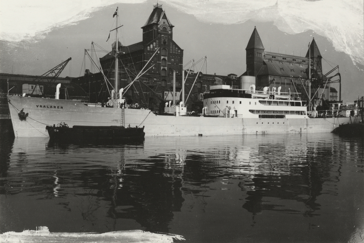 Foto i svartvitt visande lastmotorfartyget "VAALAREN" av Göteborg vid kaj i Köpenhamn någon gång under åren 1936-39.