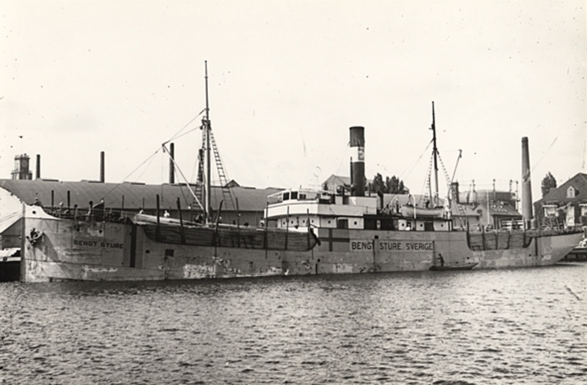 Foto i svartvitt visande lastångfartyget "BENGT STURE" av Trelleborg, vid kaj i Köpenhamn, troligen i början av 1940-talet.