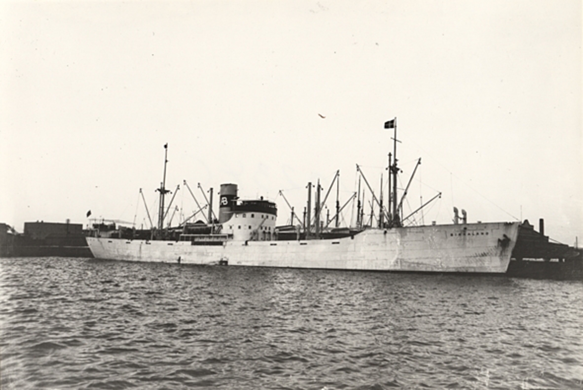 Foto i svartvitt visande lastmotorfartyget "BIRKALAND" vid kaj i Köpenhamn under 1930-talet.