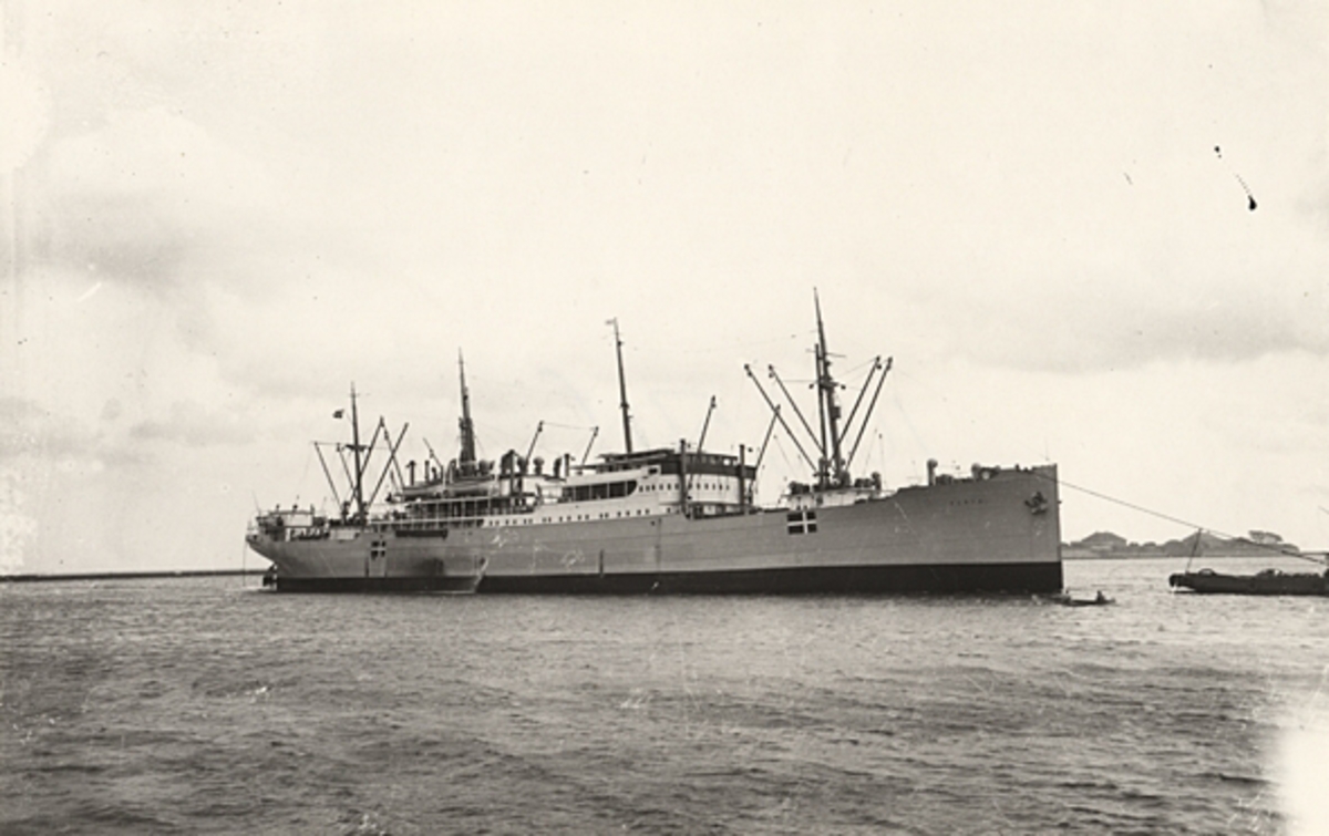 Foto i svartvitt visande last- & passagerarmotorfartyg "ALSIA" av Köpenhamn under bogsering i Köpenhamn 1939-1940 talet.