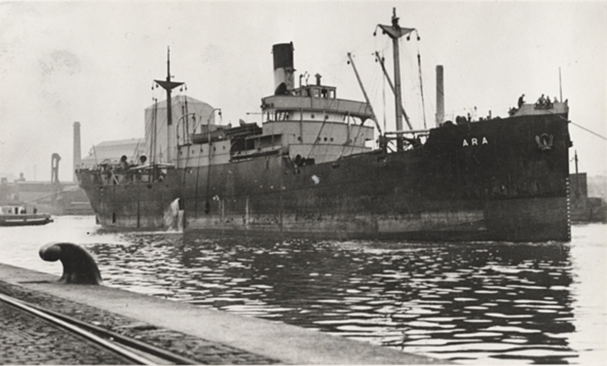 Lastångfartyget ARA. Minsprängt den 8 april 1942 i Nordsjön utanför Borkum. Besättningen räddad.