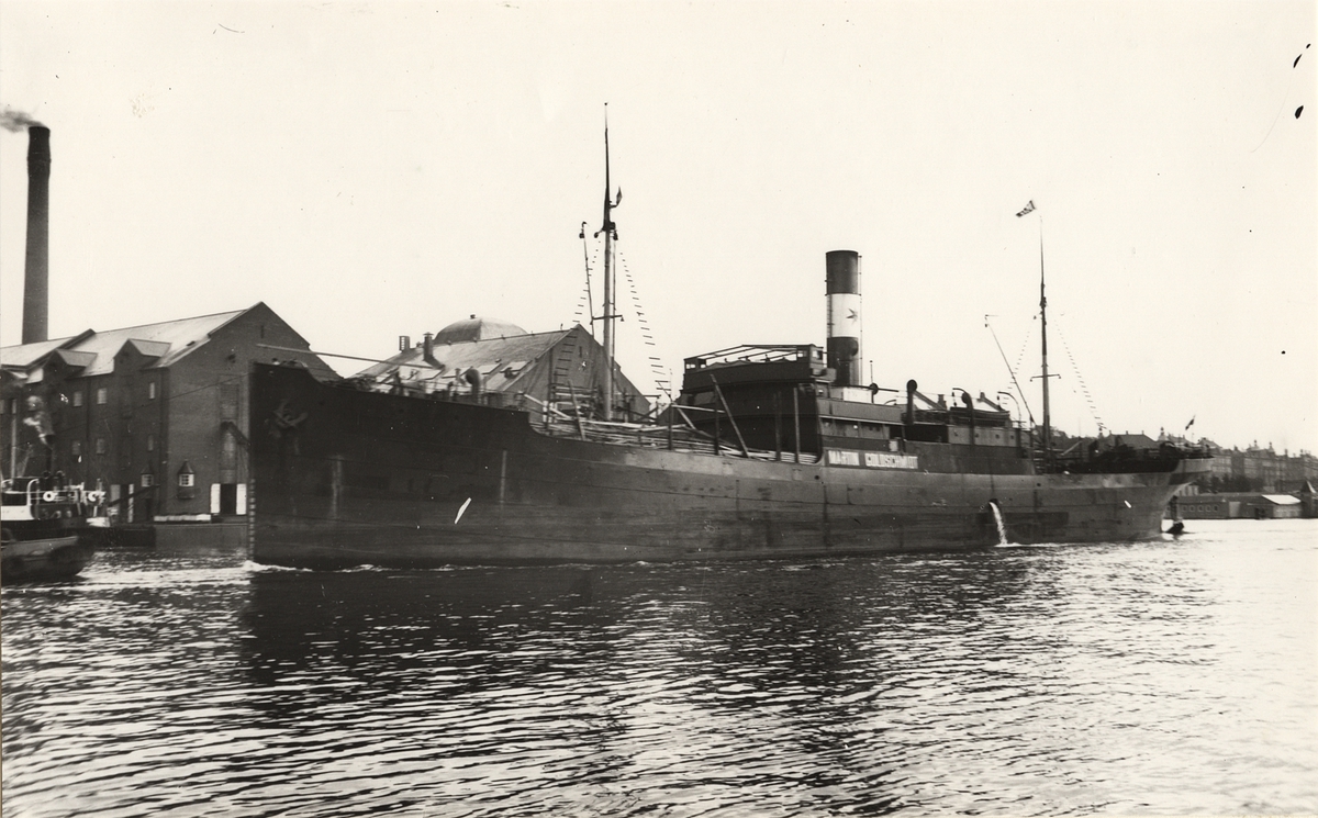 Foto i svartvitt visande lastångfartyget "MARTIN GOLDSCHMIDT" av Köpenhamn i Köpenhamn under 1930-talet.