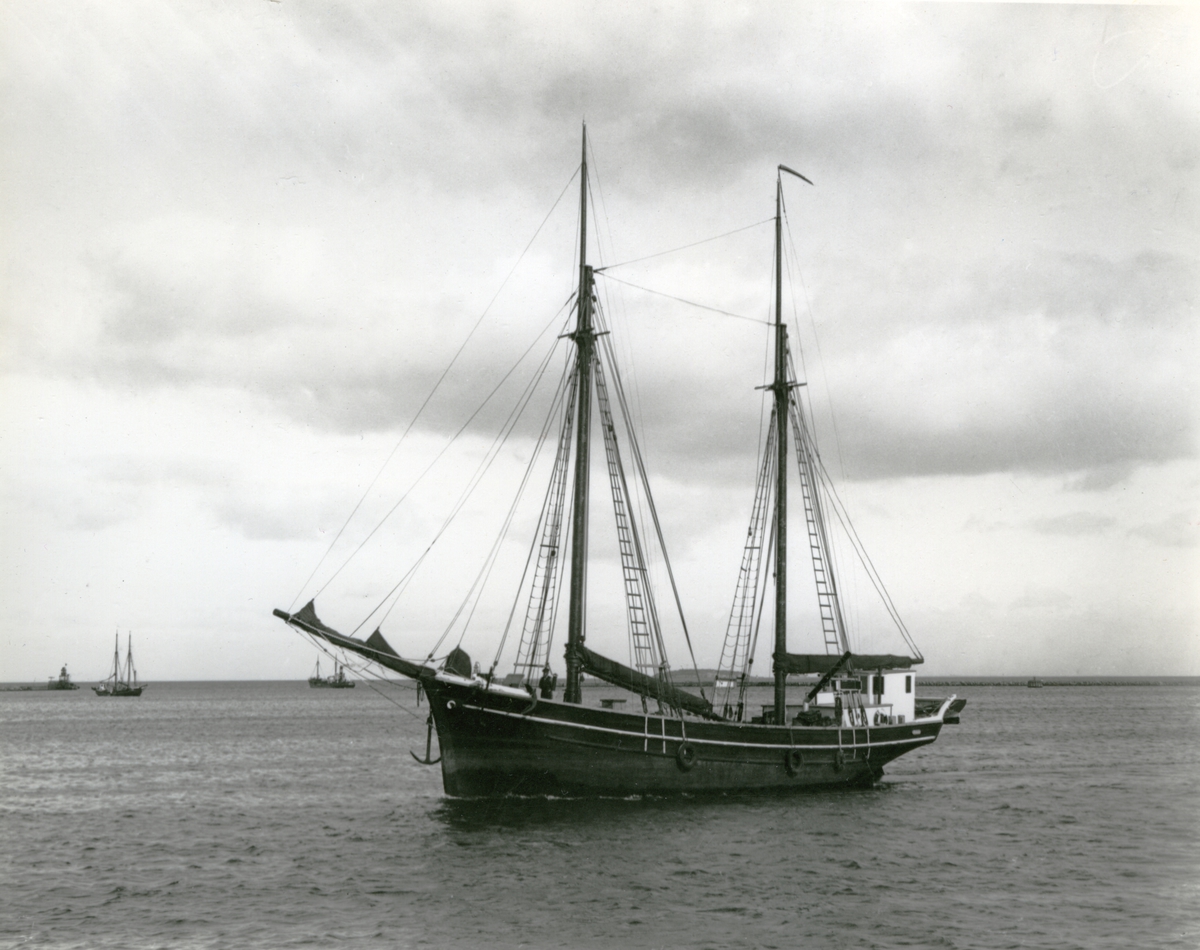 [från fotobeskrivning:] "Foto i svartvitt visande 2-mastade motorskonaren 'JOHNNY' i farvatten kring Köpenhamn."