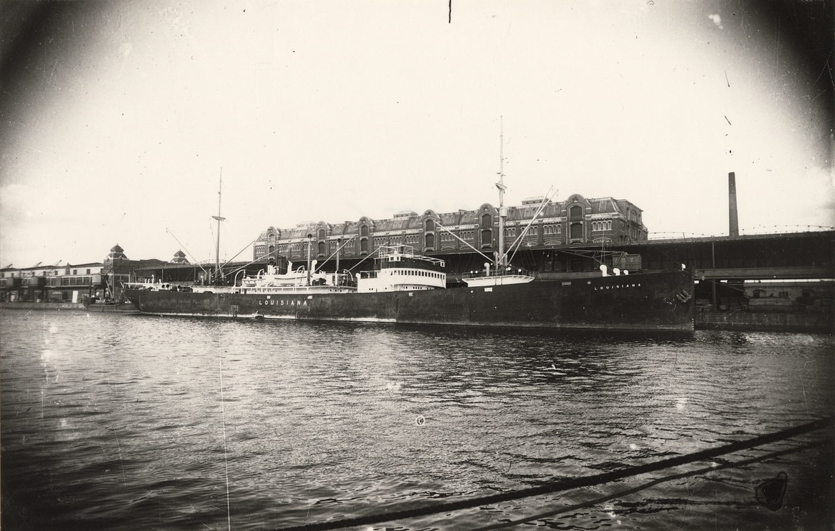 Foto i svartvitt visande lastmotorfartyget "LOUISIANA" av Köpenhamn i Köpenhamn under 1930-talet.