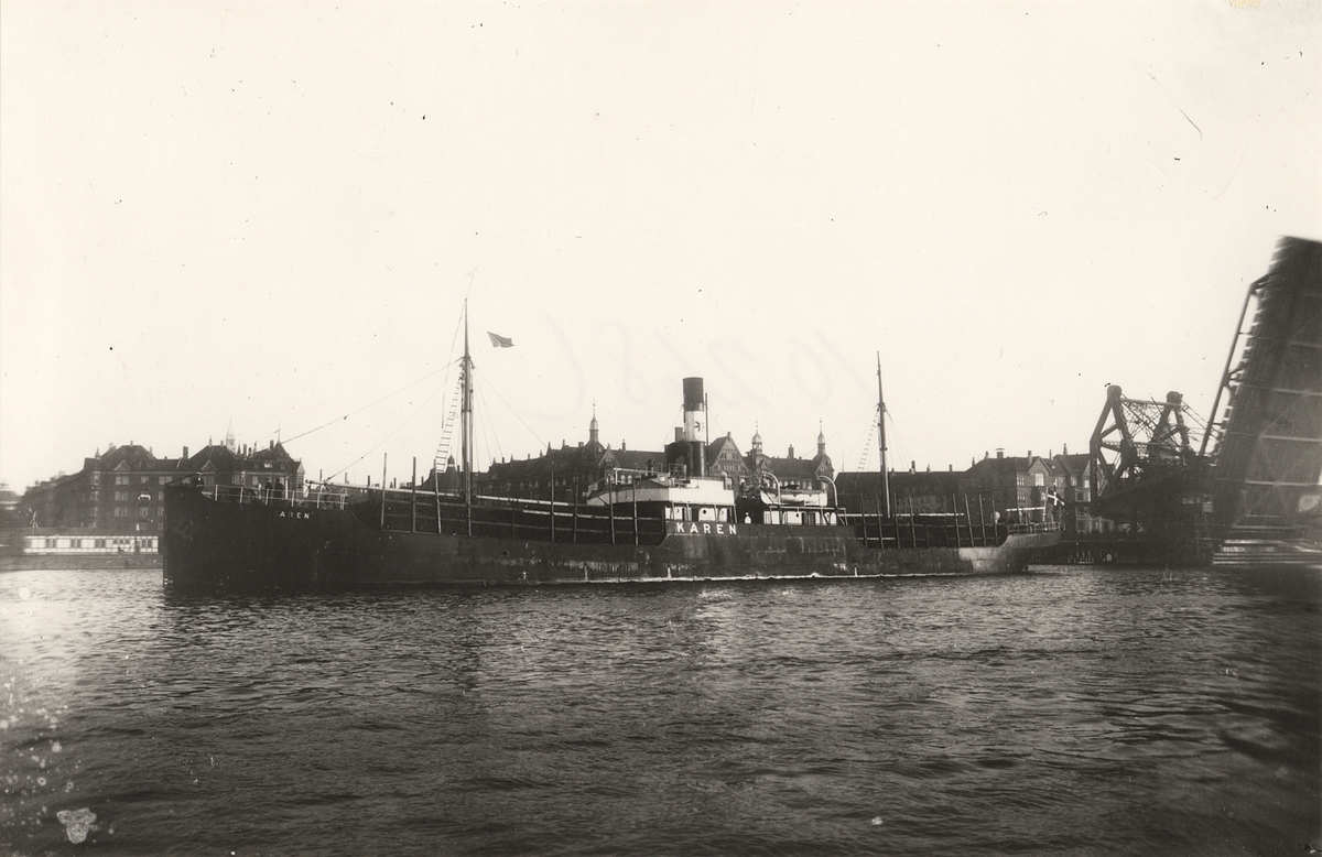 Foto i svartvitt visande lastångfartyget "KAREN" av Köpenhamn i Köpenhamn under 1930-talet.