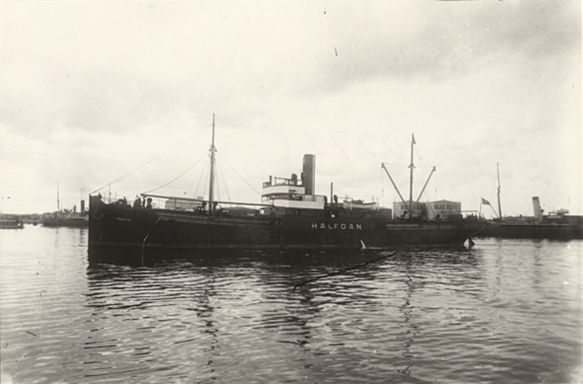 Foto i svartvitt visande lastångfartyget "HALFDAN" av Köpenhamn i Köpenhamn under 1930-talet.