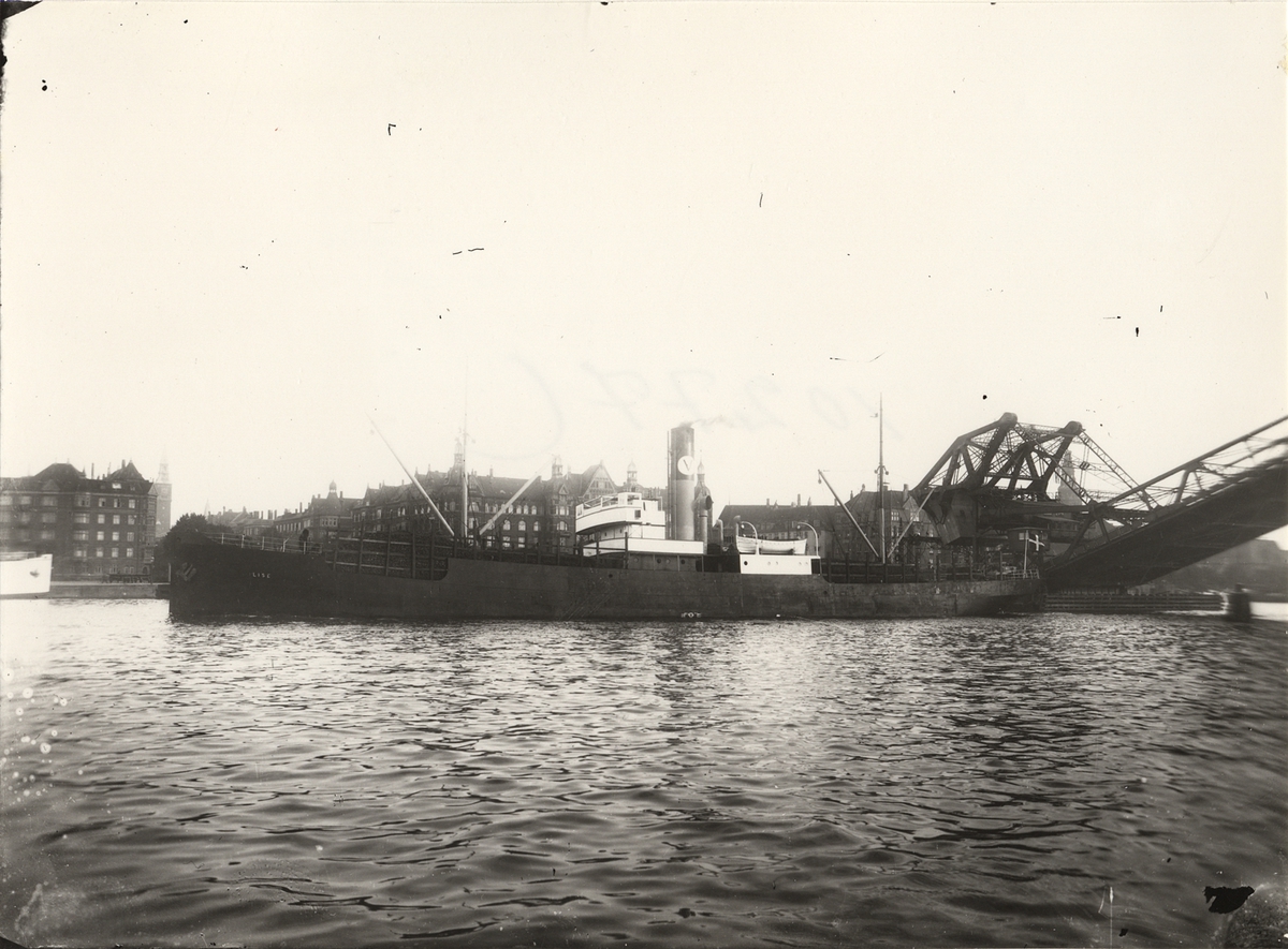 Foto i svartvitt visande lastångfartyget "LISE" av Köpenhamn i Köpenhamn under 1930-talet.