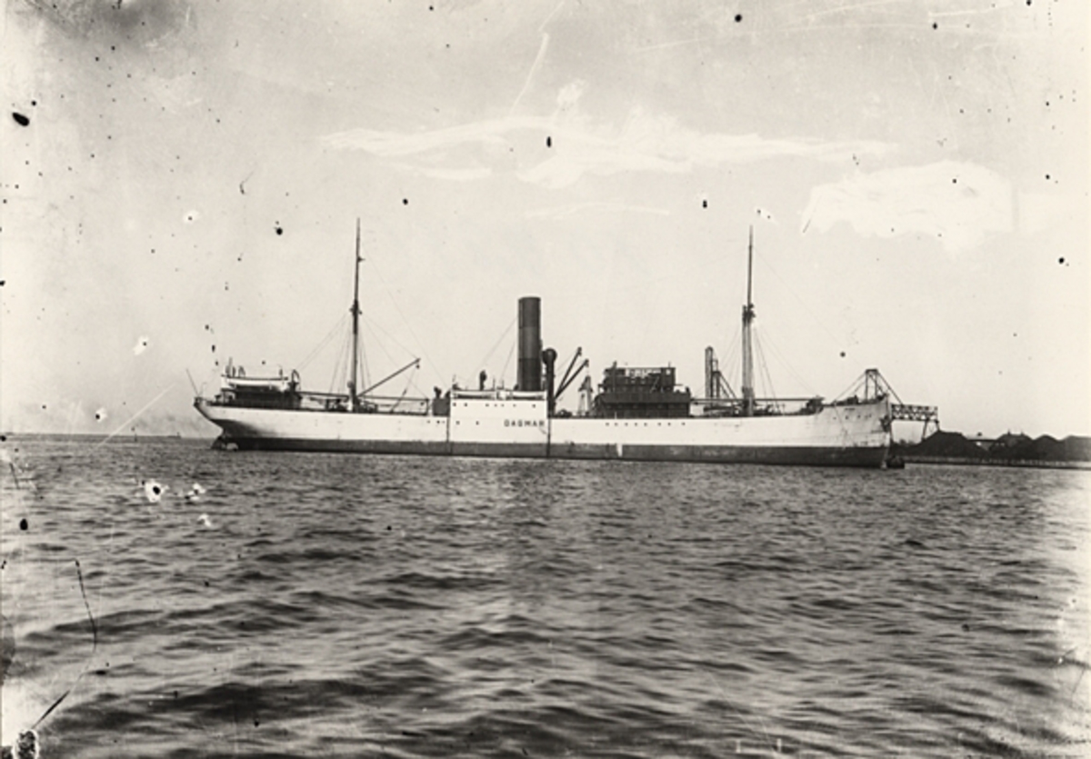 Foto i svartvitt visande lastångfartyget "DAGMAR" av Aalborg i Köpenhamn.
