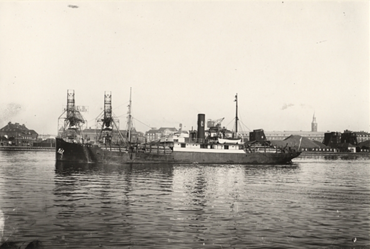 Foto i svartvitt visande lastångfartyget "FRIDA" av Simrishamn i Köpenhamn under 1930-talet.