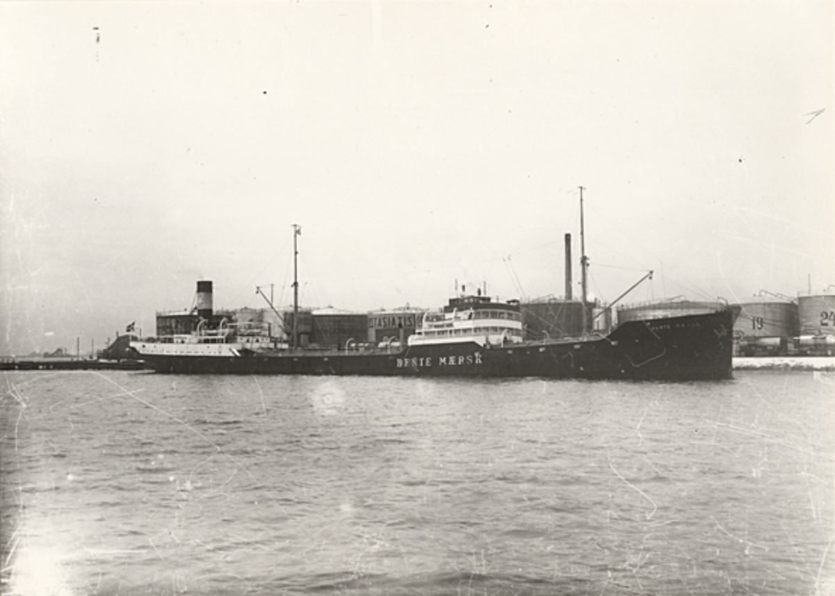 Foto i svartvitt visande tankmotorfartyget BENTE MAERSK av Svendborg i Köpenhamn under 1930-talet.