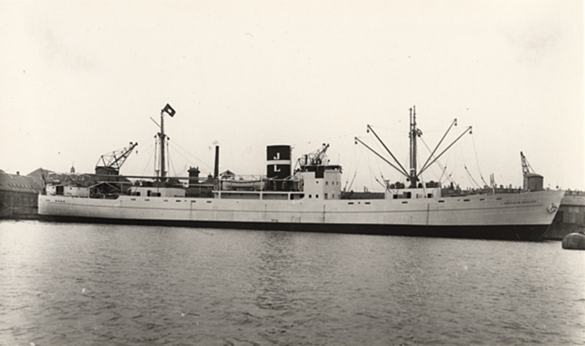 Foto i svartvitt visande lastmotorfartyget "CHILEAN REEFER" av Esbjerg vid kaj i Köpenhamn.
