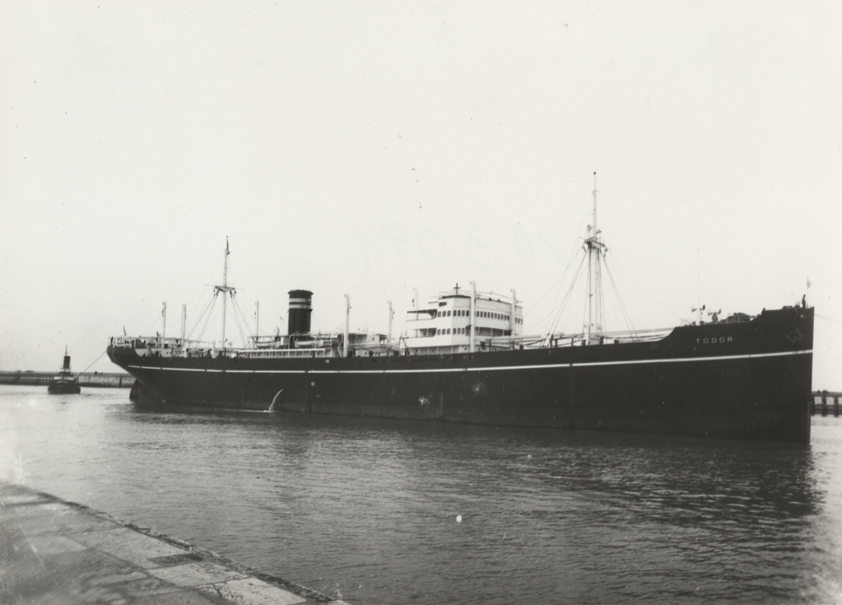 Foto i svartvitt visande lastmotorfartyget "TUDOR" av Tönsberg under bogsering i Köpenhamn under 1930-talet.