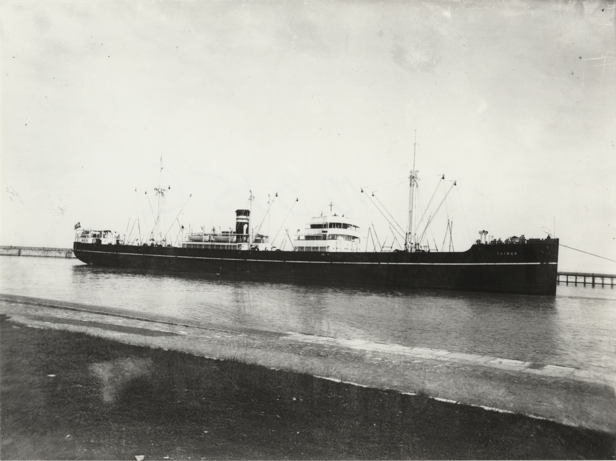 Foto i svartvitt visande lastmotorfartyget "TAIWAN" av Tönsberg i Köpenhamn under 1930-talet.