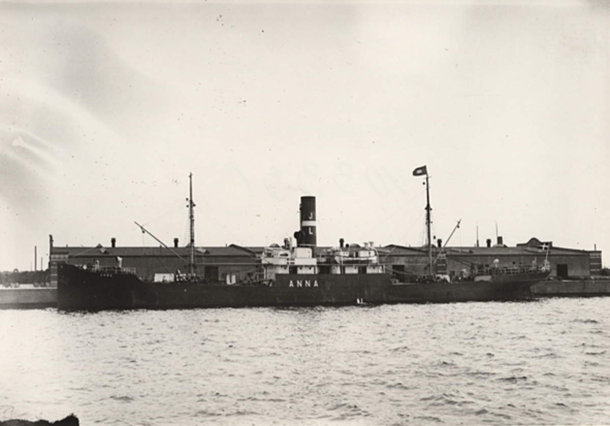 Foto i svartvitt visande lastångfartyget "ANNA" av Esbjerg, vid kaj i Köpenhamn under 1930-talet.