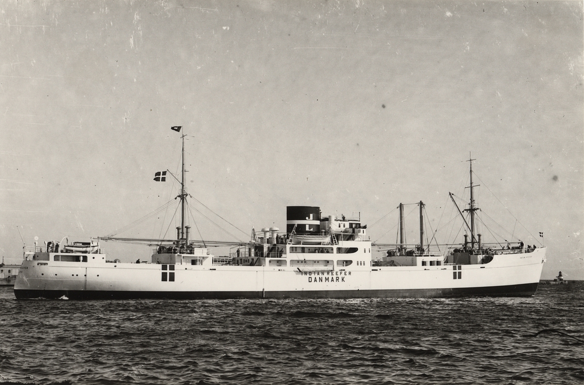 Titel: Foto i svartvitt visande lastmotorfartyget "INDIAN REEFER" av Esbjerg i Köpenhamn 1939-40.