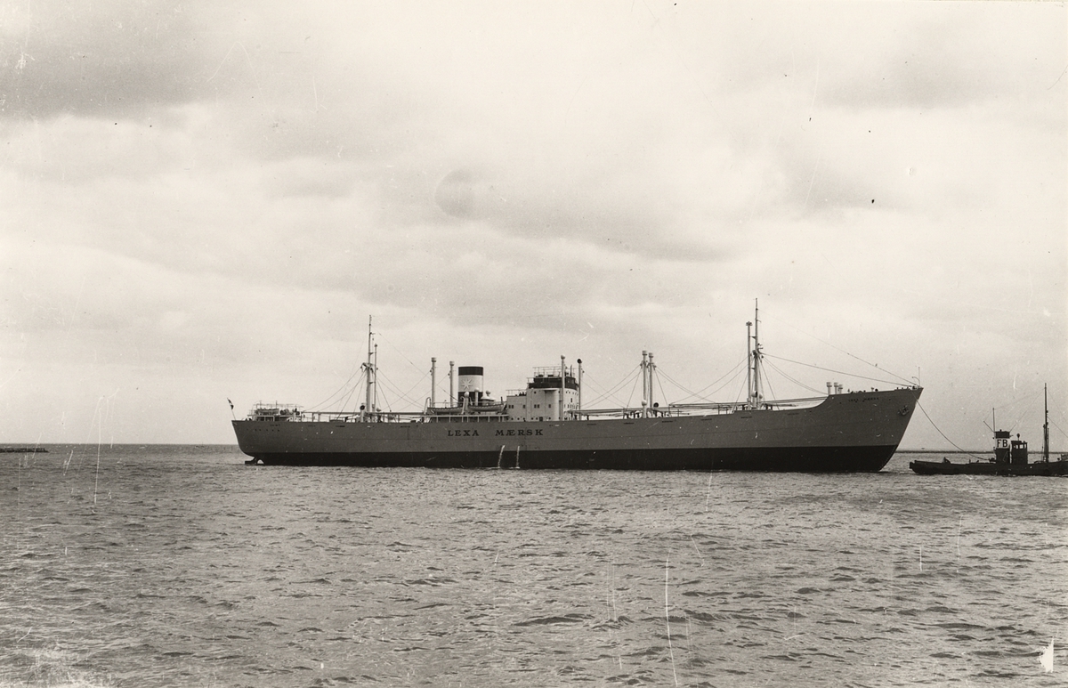 Foto i svartvitt visande lastmotorfartyget "LEXA MAERSK" av Köpenhamn under bogsering i Köpenhamn.