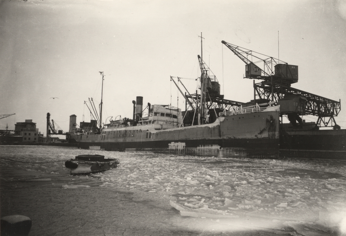 Foto i svartvitt visande lastångfartyget "SUSAN MAERSK" av Aalborg, vid kaj i Köpenhamn under 1939-41.