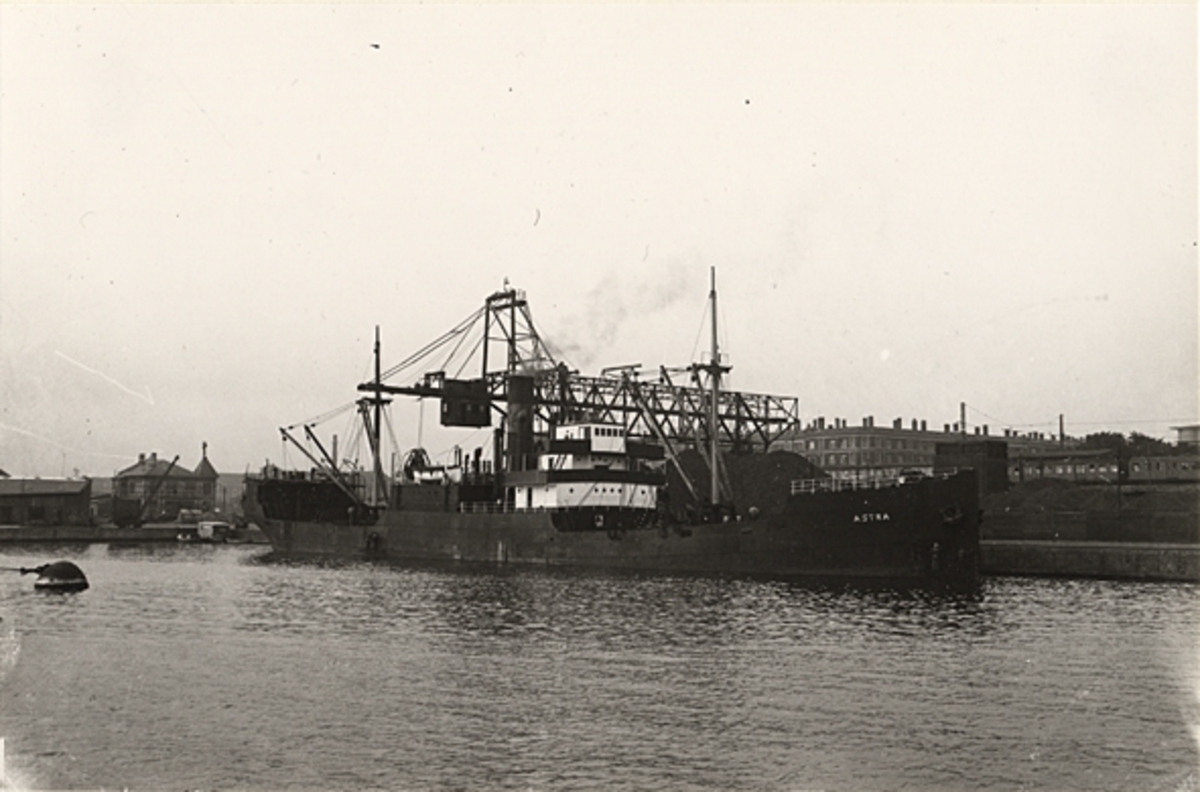 Foto i svartvitt visande lastångfartyget "ASTRA" av Köpenhamn vid kaj i Köpenhamn under 1930-talet.