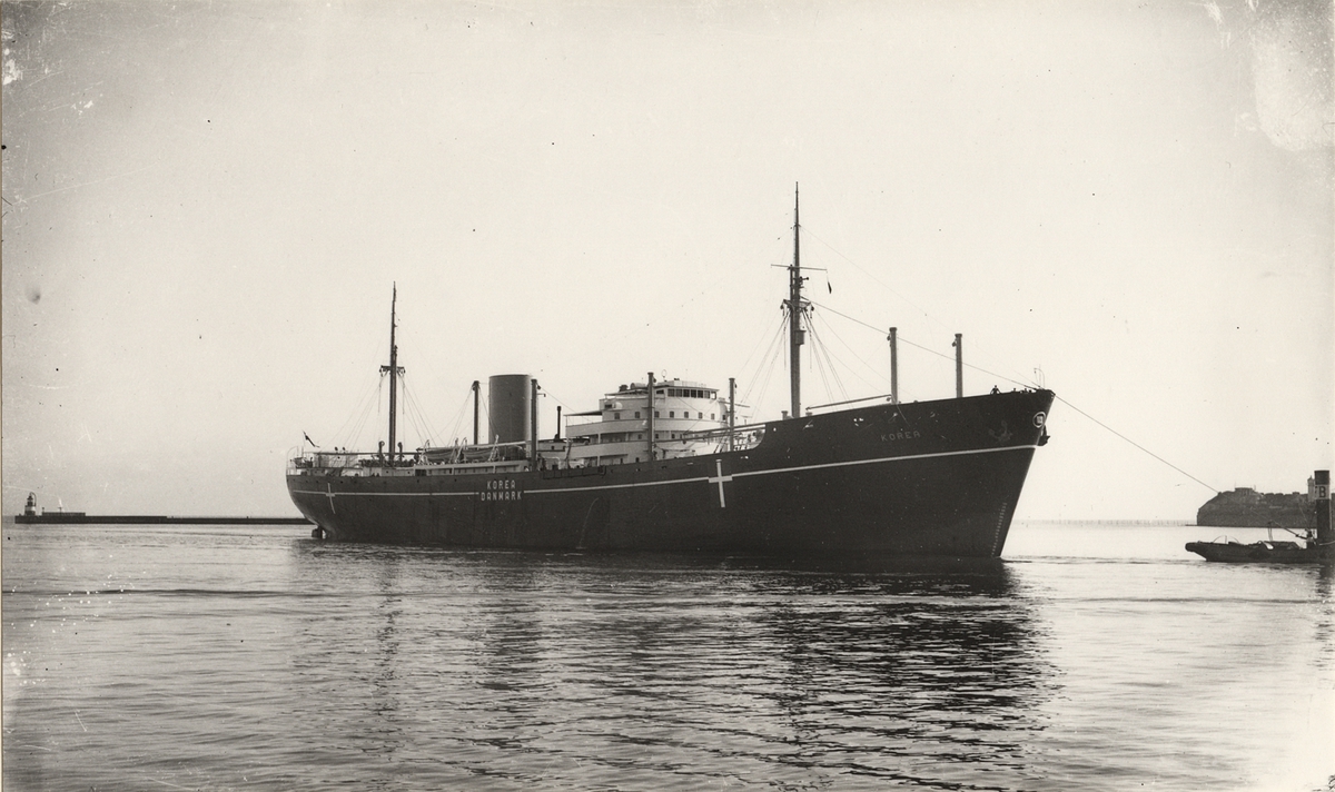 Foto i svartvitt visande lastmotorfartyget "KOREA" av Köpenhamn i Köpenhamn under 1939-40.