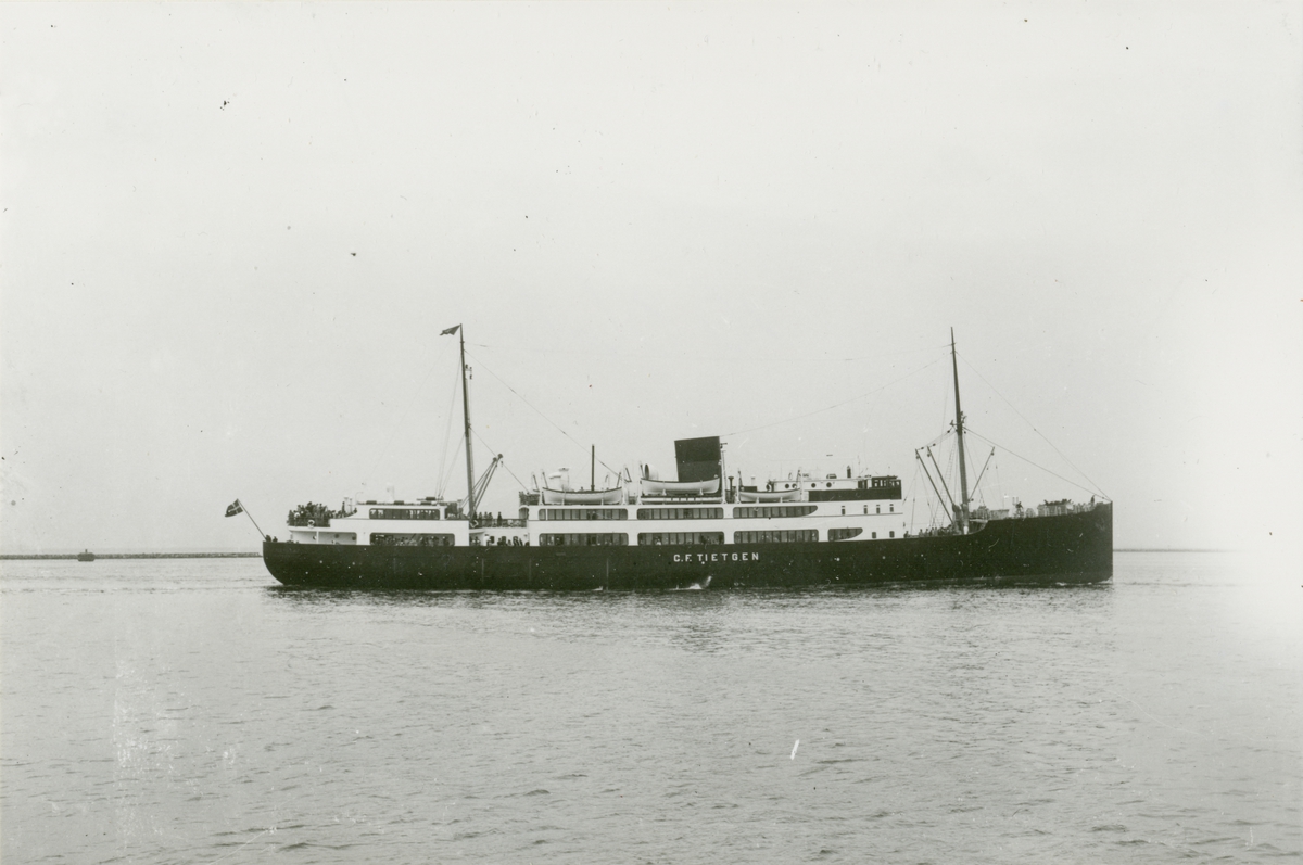 Foto i svartvitt visande passagerarmotorfartyg C.F.TIETGEN av Aarhus i Köpenhamn.